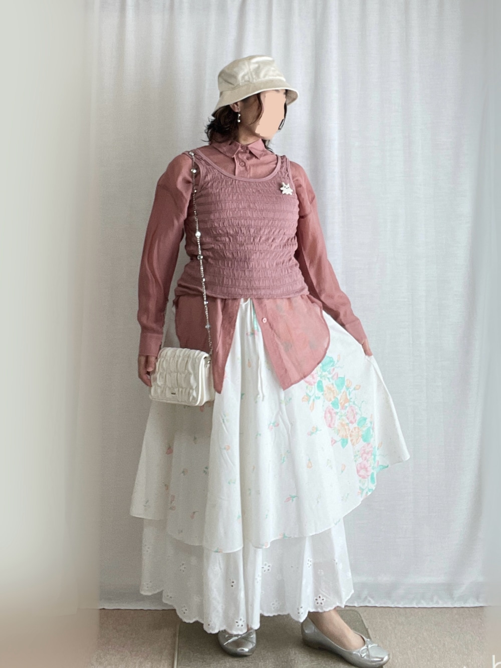 見ていただき、ありがとうございます! いいね、お気に入り、フォロー、とってもうれしいです♪ 7月7日🎋 ☁️35℃/27℃。 暑い日。 古着の朝顔柄スカートを着ました。 だいぶ古いスカートですが、着られるうちは毎年一度くらいは着たいと思っていて、この時期にコーデしてます。 レイヤードコーデ。 シアーシャツの上にタンクトップ、古着スカートの下に長めのレーススカートを重ねました。 タンクトップは丈が長いので折ってます。 ピンクシャーリングタンクトップ ピンクシアーシャツ 白朝顔柄スカート 白コットンレースティアードスカート シルバーバレエシューズ 白ビジューストラップミニショルダー 白バケハ おばけうさぎブローチ シルバーボールイヤリング