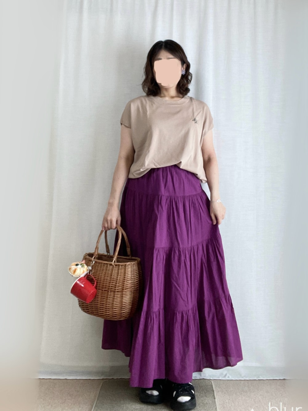 見ていただき、ありがとうございます! いいね、お気に入り、フォロー、とってもうれしいです♪ 8月14日 🌞☁️34℃/25℃。 過去コーデ ニット×ティアードスカート。 かごバッグに自作チャームを付けました。 ベージュ胸刺繍ニット パープルティアードスカート 黒スポサン かごバッグ(&マグカップチャーム) シルバー結び目ブレスレット クリアパープルフラワーイヤリング
