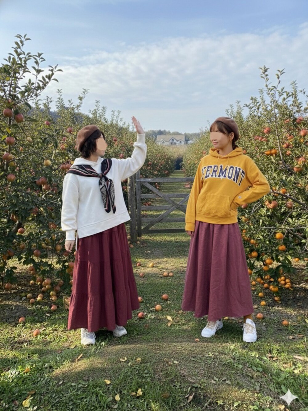 見ていただき、ありがとうございます! いいね、お気に入り、フォロー、とってもうれしいです♪ 12月3日 #似たものあわせっこ ゆみっつと、同じ生成AIを使ってあわせっこしました♪ ゆみっつ、いつもありがとう💕 テーマは収穫祭。りんご狩りとお芋掘り🍎🍠 全ページAIで作りました。 始めたばかりでなかなか意思疎通できないところもあって、もっとAIと分かり合えたらなと思います。 post1 りんご園前で待ち合わせ。(パーカー×スカート) りんごを狩る気満々な2人。 post2 りんご狩り。色違いのearthスウェット×カーゴパンツにお着替え。 お互い集中してどんどん収穫します!私、念動力でカゴを浮かせてる… post3 サツマイモっぽい配色のコーデで落穂拾いならぬお芋拾い。心なしか顔立ちも西洋風になっちゃってます。 post4 (色違いのスウェット×パンツ×スカーフ) 収穫したお芋を焚き火で調理。静かな時間が流れます。 post5 実食!和気藹々と。最後の晩餐風に。見事にりんごとサツマイモだけが並ぶ食卓。 小窓 美味しかった!紅葉を眺めながら帰ります。 トップスはパーカーで、お互いの手持ちのボトムスを貸し借りしてみました。