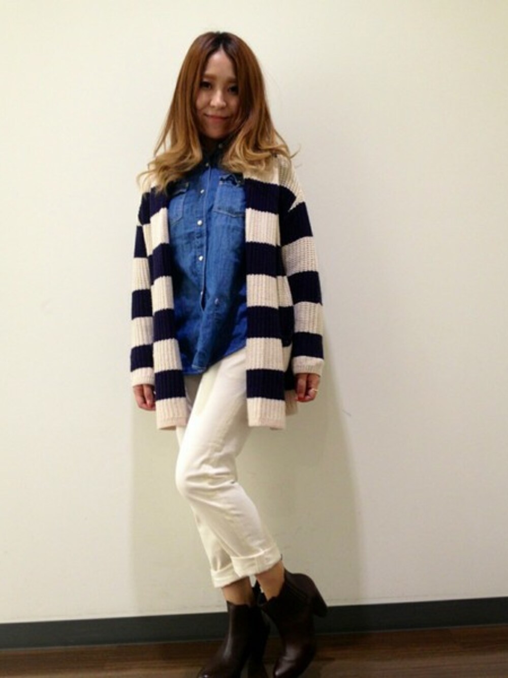 ボーダーカーディガンに白パンツを合わせて爽やかに!白パンツもコーデュロイ素材なら秋モード全開!!