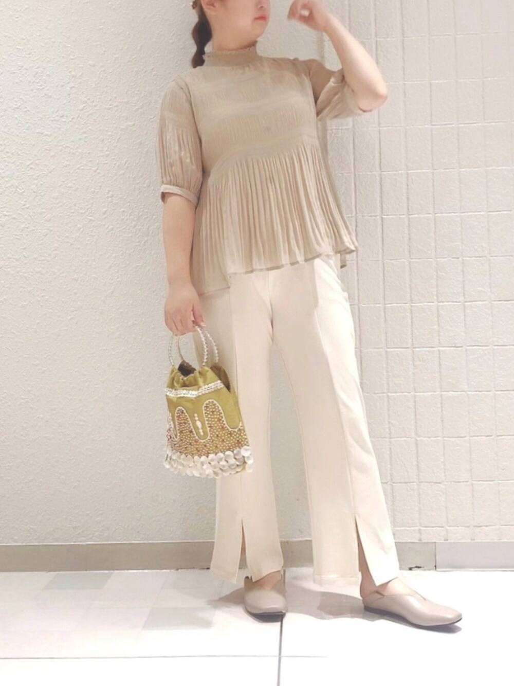 センタープレススリットパンツ着回しDAY1🤍 シアープリーツブラウスに スリットパンツを合わせて キレイめコーデにしました🌼 かなり重宝している 秋流行りのバブーシュ🥿 通販サイトストライプクラブで 好評発売中です🛒💨 シアープリーツブラウスは earth music&ecology 新宿ルミネエスト店にて ¥2,189(税込)で お求めいただけます😍❣️ 皆様のご来店お待ちしております🙌