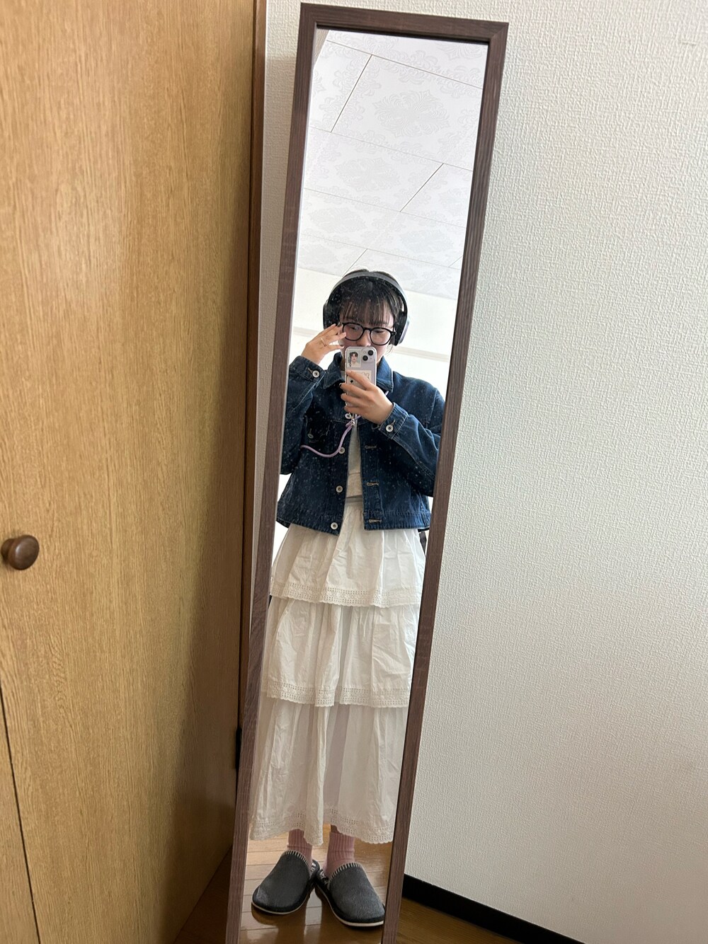 UNIQLOのデニムジャケットで春先取りコーデ🌸 大好きなあさぎーにょちゃんのブランドPOPPYのティアードスカートとの合わせが超絶可愛いの🌼 スリッパダサい😂