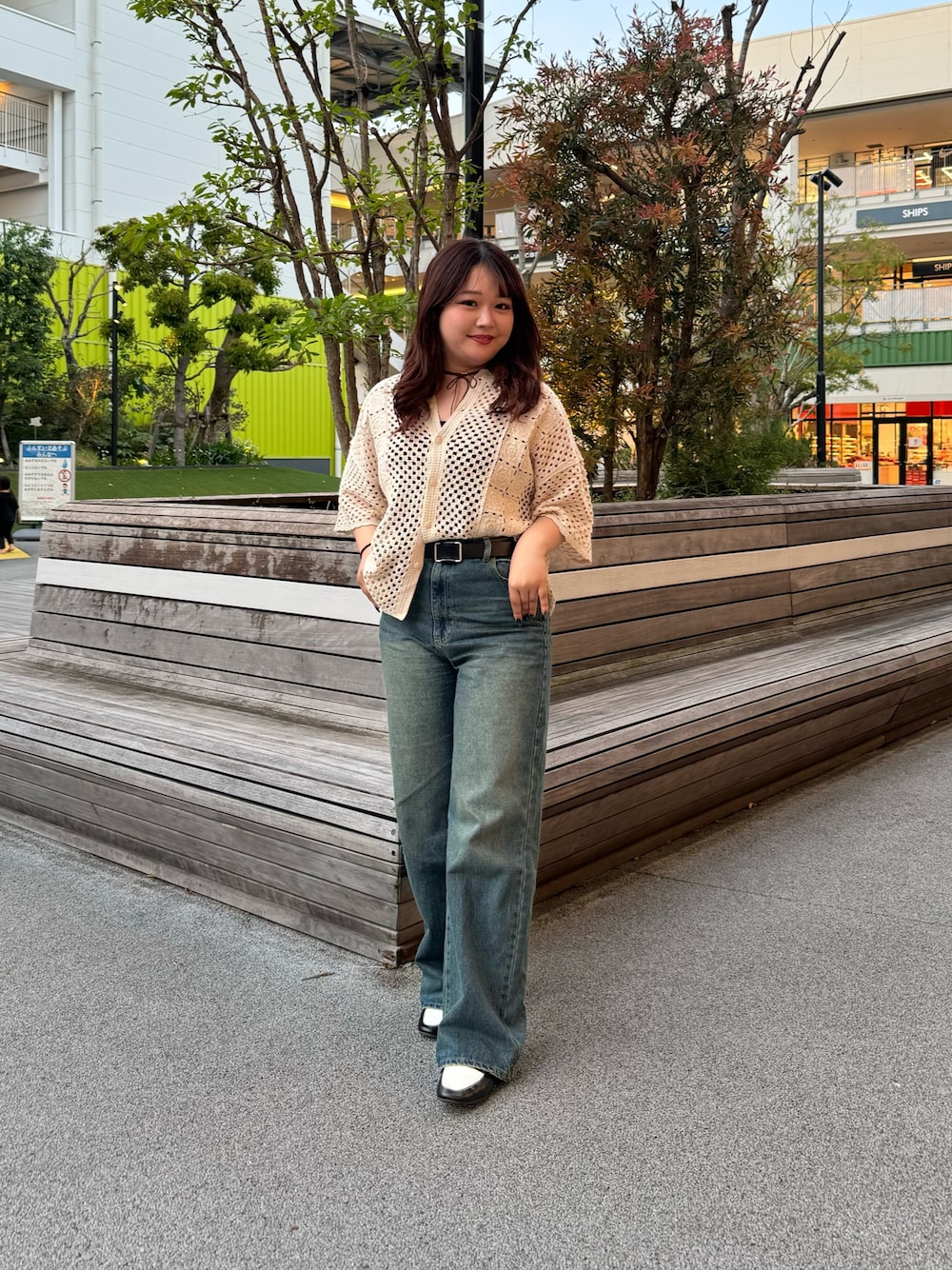 カーディガンがメッシュ素材なので、重ね着しても涼しく着れます💙 ・ デニムは、ぽっこりお腹を包み込んでくれるので、安心してタックインできます! ・ ウエストマークのベルトも忘れずに☺️