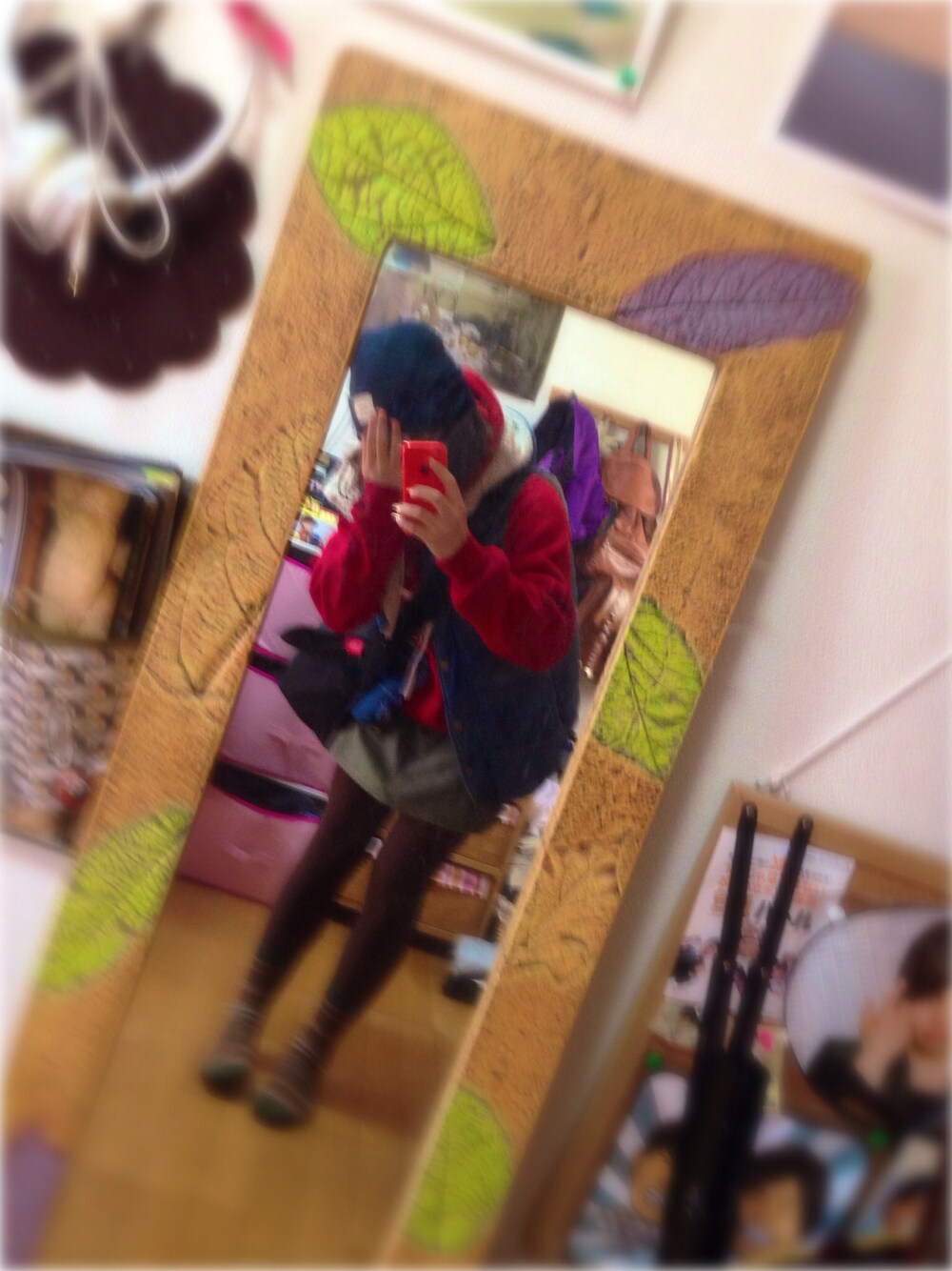 デニムダウン 390yen 赤色パーカー 1470yen ニット帽 980yen バッグ マンハッタンポーテージ