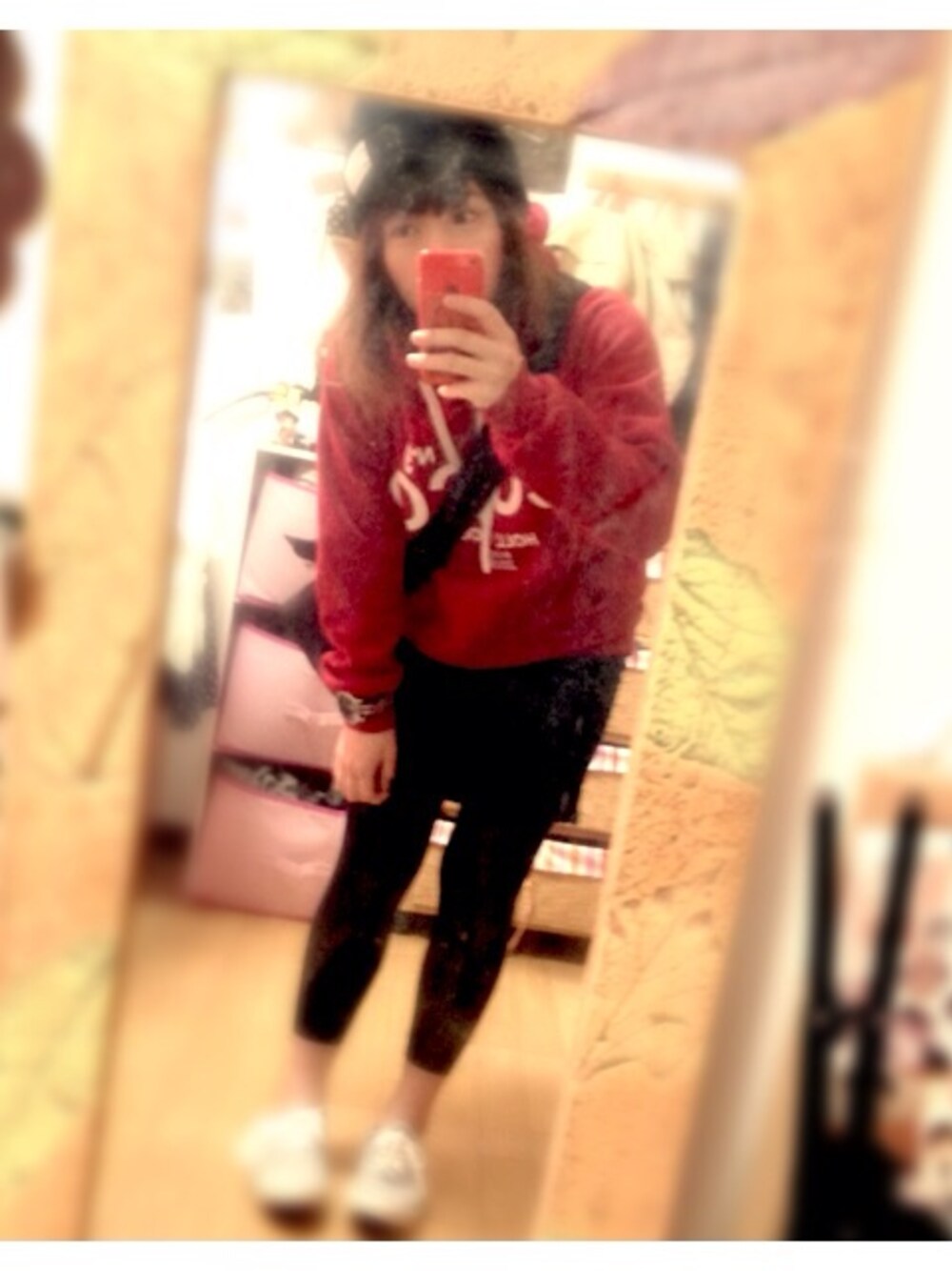 厚手のパーカー着たら 死ぬほど暑かった 真っ赤なパーカー 1000円くらい デニムスカート 1480円 靴 680円