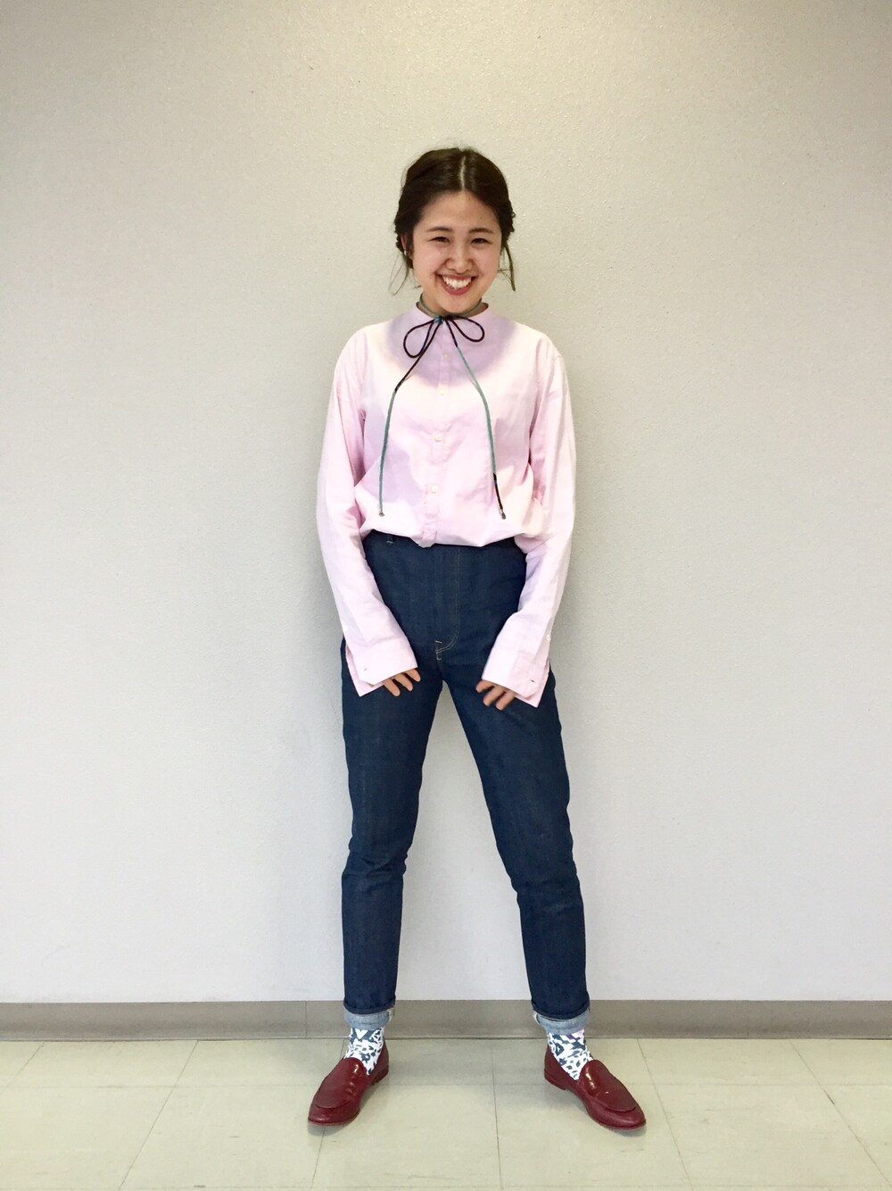 ピンク系のシャツ/ブラウス、その他のデニムパンツ、その他のソックス/靴下を着用したレディースの春コーディネートの1枚目の写真
