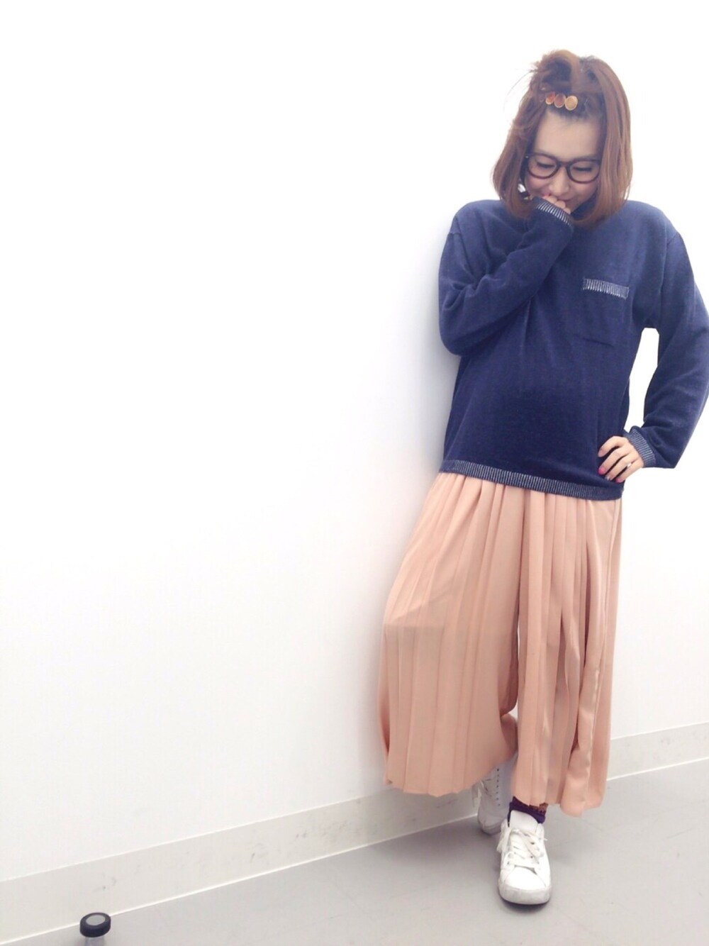 出勤こーで。 プリーツのスカンツ。 ピンク。 メンズのニット。 インディゴブルー。 すき。この組み合わせ。 こうゆうかんじ。 このお値段で出来ちゃうから なおさら すき。♡ #29w #妊娠8ヶ月