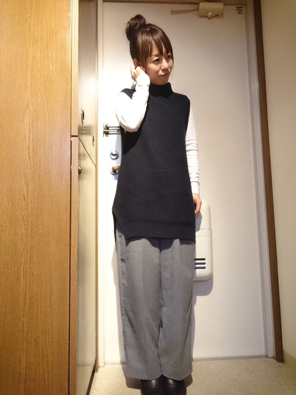 本日のお仕事コーデです😁 テーマはずるずる🙈 シャツとセットになっているワンピースのベストニットにタートルネックを合わせました😆 やっぱり身長ないんで、バランス悪いー😂 耳に髪の毛かける仕草にしてみたら、なんか「もしもーーし」って感じになっちゃいました😳
