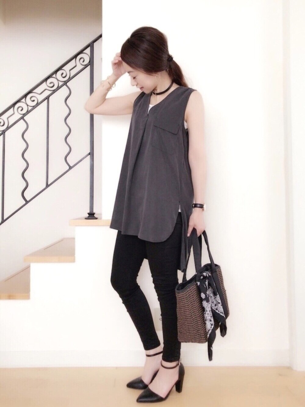 撮り溜めコーデでドラフトに参加させて頂きまーす☺️ 大人カジュアルでシンプルに。 前回のコーデのトップスを変えてコーデしてみたものです。 ビーズ付きのキャミタンクは色違いの白です。丈感もあるので、スリットの入ってるこのノースリーブから、こちらもチラリと見えてポイントになるかと。 ノースリーブは色表示はブラックですが、グレーがかったなんとも言えないヴィンテージっぽい色です。 生地も光沢感もあり、綺麗目にもカジュアルにも着れます。 長さもあって、お尻も隠れるのでスキニーを履いても安心です。 スキニーは前回と同じパンツで、ストレッチが効いていて、とても履きやすいのでついついこちらもヘビロテしてしまいます。 パンプスはストラップがあることで足元が綺麗に見えるのも嬉しいです。ヒールの高さはありますが太めなので、安定感もあるので履いていても歩きやすいです。 バッグはレプシムのもので、ブラウンとブラックのストローで編まれて作られているので、落ち着いた感じの色合いで、更に上の部分が巾着ぽくしばれるので中身を隠してくれます。 私のようにすぐ転んで中身をぶちまけてしまう様な人には巾着になっているのは重要ポイント。 今日もドラフトコーデにお付き合いありがとうございました💗 みんなからのいいね♡save、コメントがとても嬉しく励みになっています💗 感謝の気持ちでいっぱいです✨✨✨