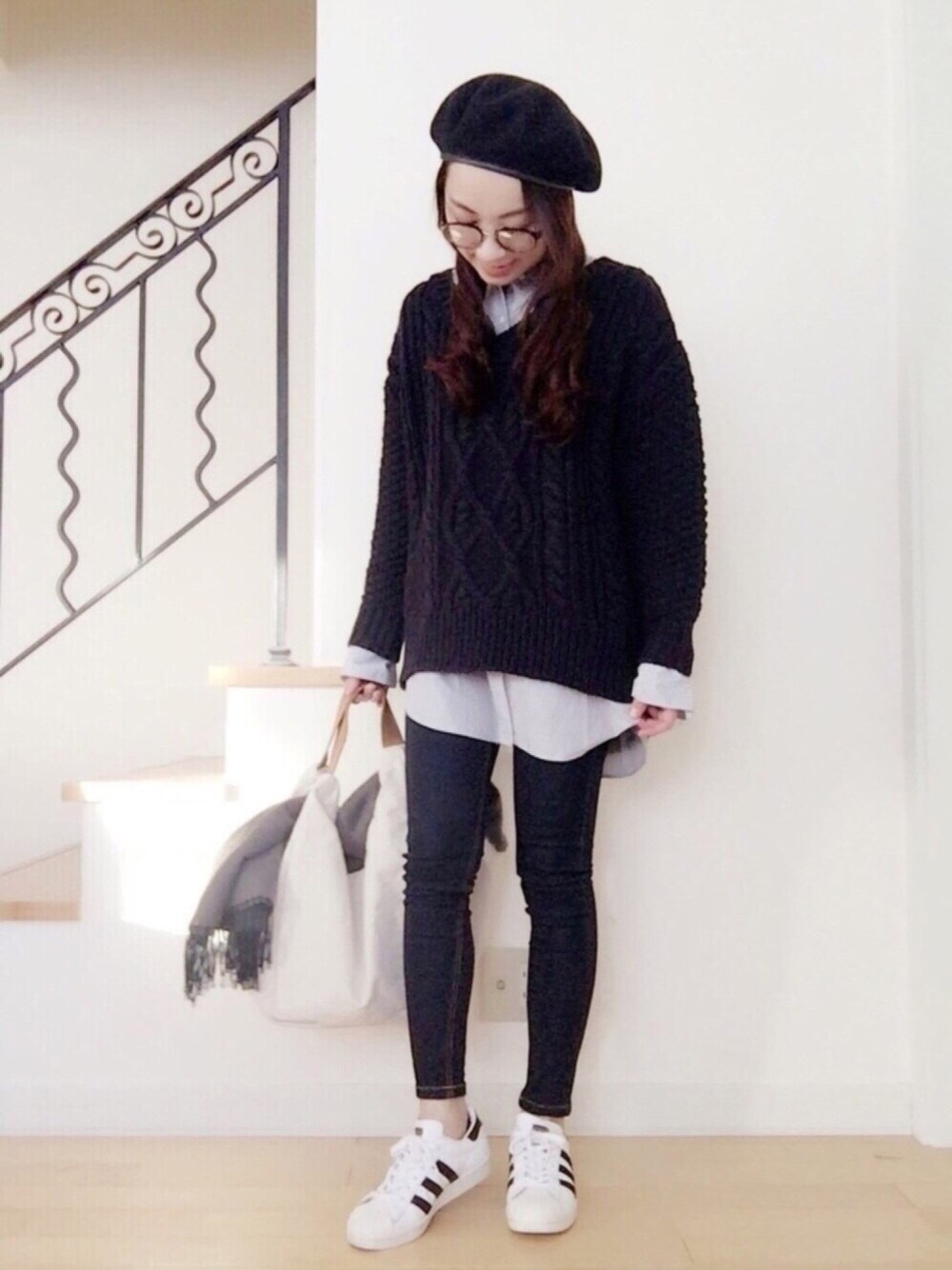 ニットとシャツのレイヤードコーデ。 黒っぽく見えるけど、ニットの色はダークネイビーです♬ ストライプのシャツとのレイヤードでチラ見せ。 これはよーく見てもストライプが見えませんね😅 被り物はベレー帽。 靴はadidasのスーパースター。 何にでも合わせやすくてついついヘビロテ(^_-) 沢山のいいね♡save、コメント、フォローありがとうございます(о´∀`о) とても嬉しく、励みになっています!! 感謝の気持ちでいっぱいです(((o(*゚▽゚*)o)))♡ 今日もhappyで素敵な一日になりますよーに💗
