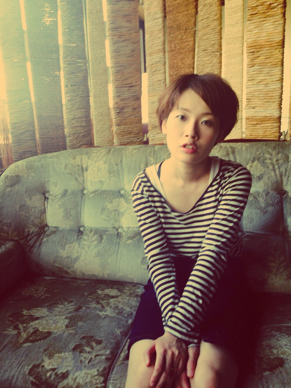ボーダーT(ブランド不明) 白スニーカー(GU) カフェで。不意打ちショット(´ω`)