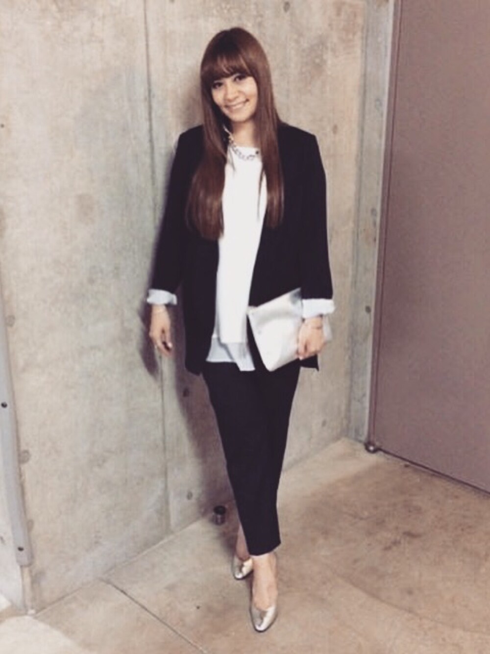 シルバー&ネイビージャケットコーデ。海外セレブに大人気のcooper&ellaブラウスはヘビロテ。ダブスタジャケットもヘビロテ!