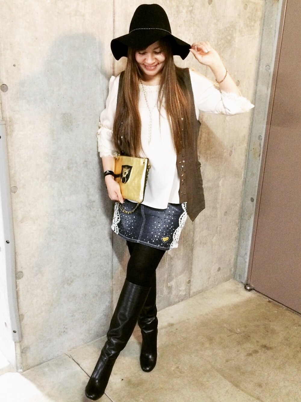 お友達のブランド&LOVE ブラウス、スタースタッズベストとデニムスカートコーデ。ネックレスもお友達の吉川まあこちゃんのブランドhinahinaのロザリオネックレス。クラッチとブレスもお友達のブランドROSA RUGA