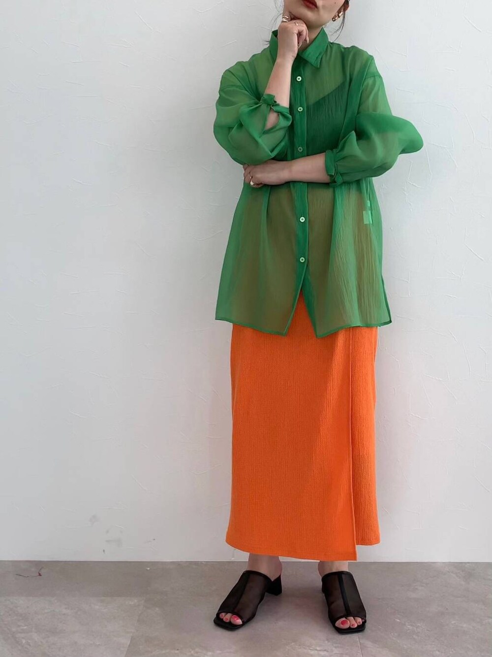 グリーン×オレンジ! 夏らしい鮮やかなコーデ。 Instagram→@eritis ※ 撮影場所の明るさなどにより、色味が若干異なっている事がございます。 カラーは公式サイトでお確かめください!