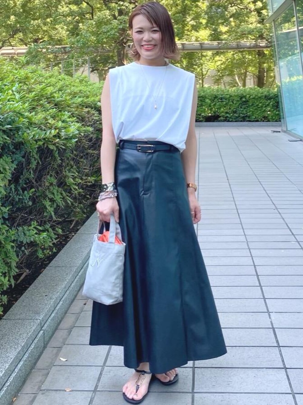 今年も人気のフェイクレザーのスカート は通年通して楽しめるアイテム。 モノトーンで大人っぽいスタイルにまとめ、イニシャル小物で抜け感を演出しました。