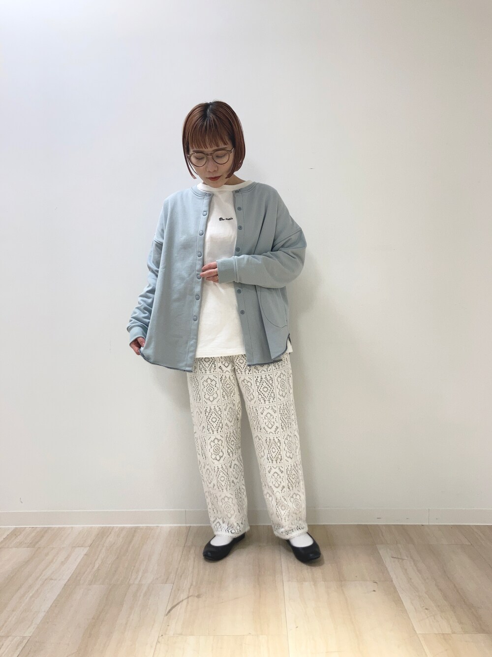 ミント色の裏毛カーディガンはスタッフ人気も高め❣️ レースパンツと合わせてナチュラルコーデに。