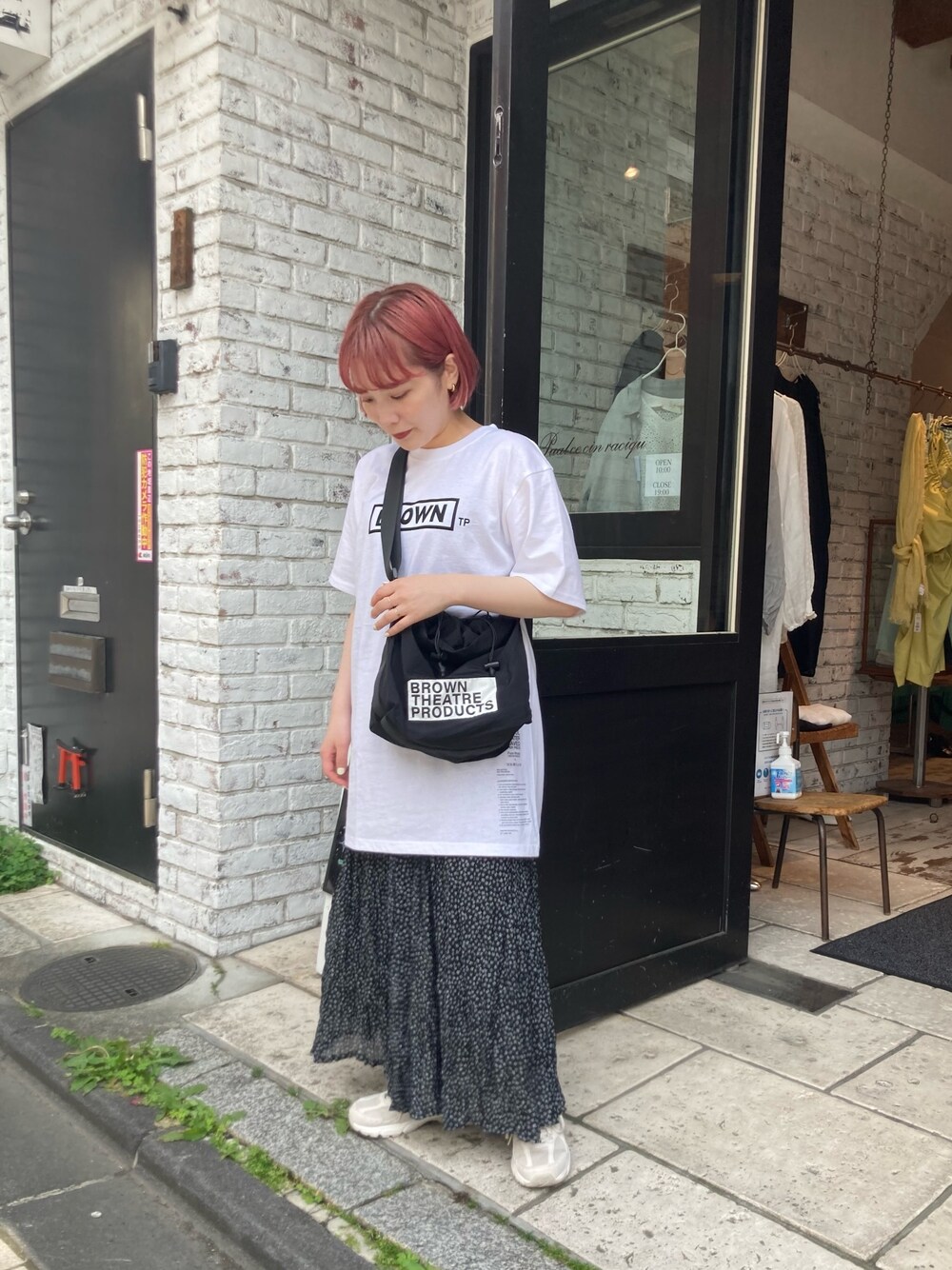シアタープロダクツコラボのTシャツでカジュアルコーデに💗 Tシャツはフリーサイズを着用🌼 スカートはウエスト1回折って着用しています🙋🏻♀️