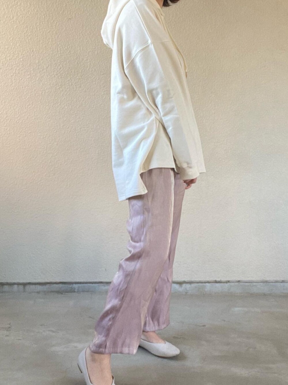 春色パンツ🌸 サテンのパンツとパンプスで上品に パーカーでカジュアルに♡ すごく動きやすいコーデ(笑)