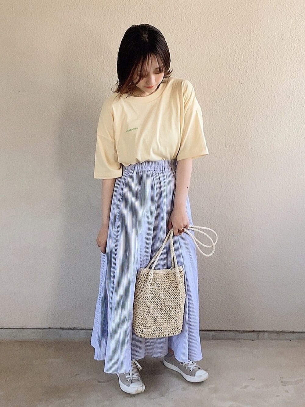 ストライプのスカート軽くて動きやすい☺︎ イエローのTシャツもロゴが小さくて程よいアクセントに、、🤍