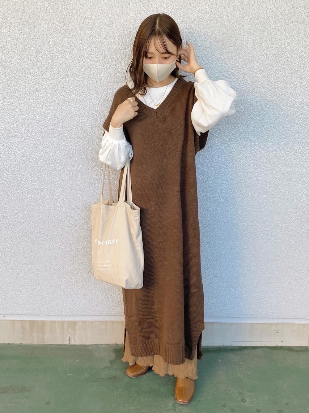 少し暖かめな日のコーデ ベストのワンピって着るだけでオシャレ〜