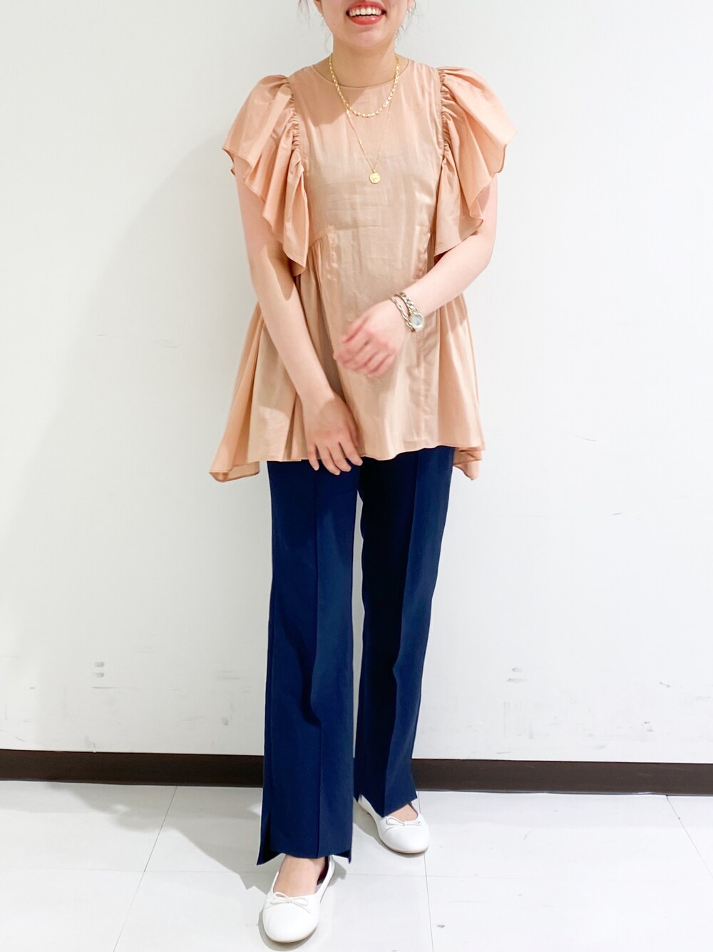 デザイントップスには シルエットが キレイなフレアパンツが◎ パンツはセールで 50%オフです💫