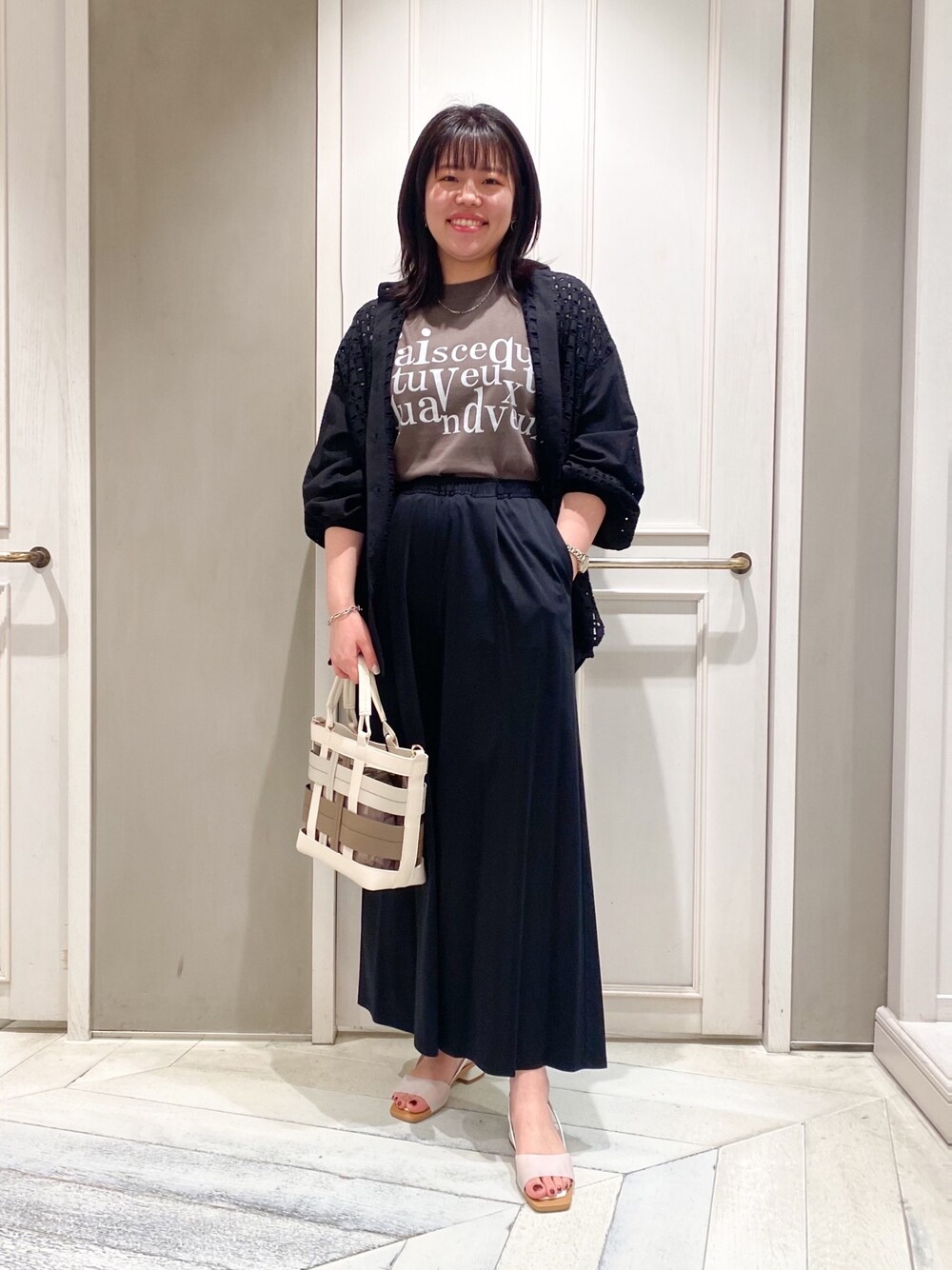 🐦⬛🐦⬛🐦⬛ 初夏の大人ブラックコーデ ブラウンのTシャツと合わせた ビニールバッグとサンダルが 一気に夏モードに◎ 色の重たさを感じないようなコーデです