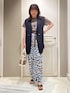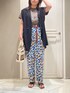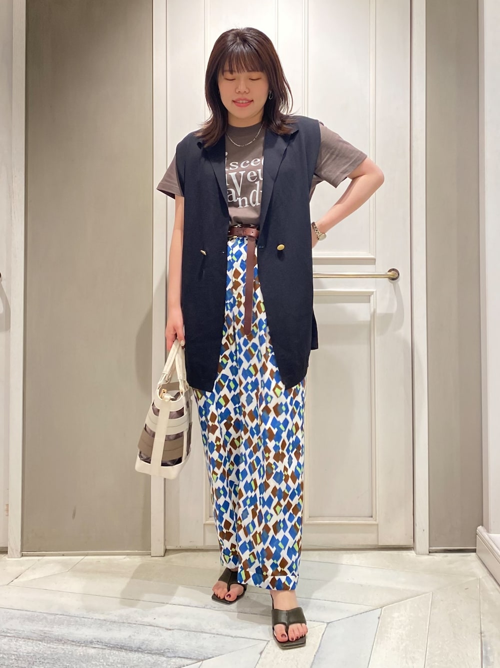 🎮🎮🎮 柄パンツのブラウンと Tシャツのブラウン合わせが ポイント🤎 ジレを着るだけで少しこなれ感◎