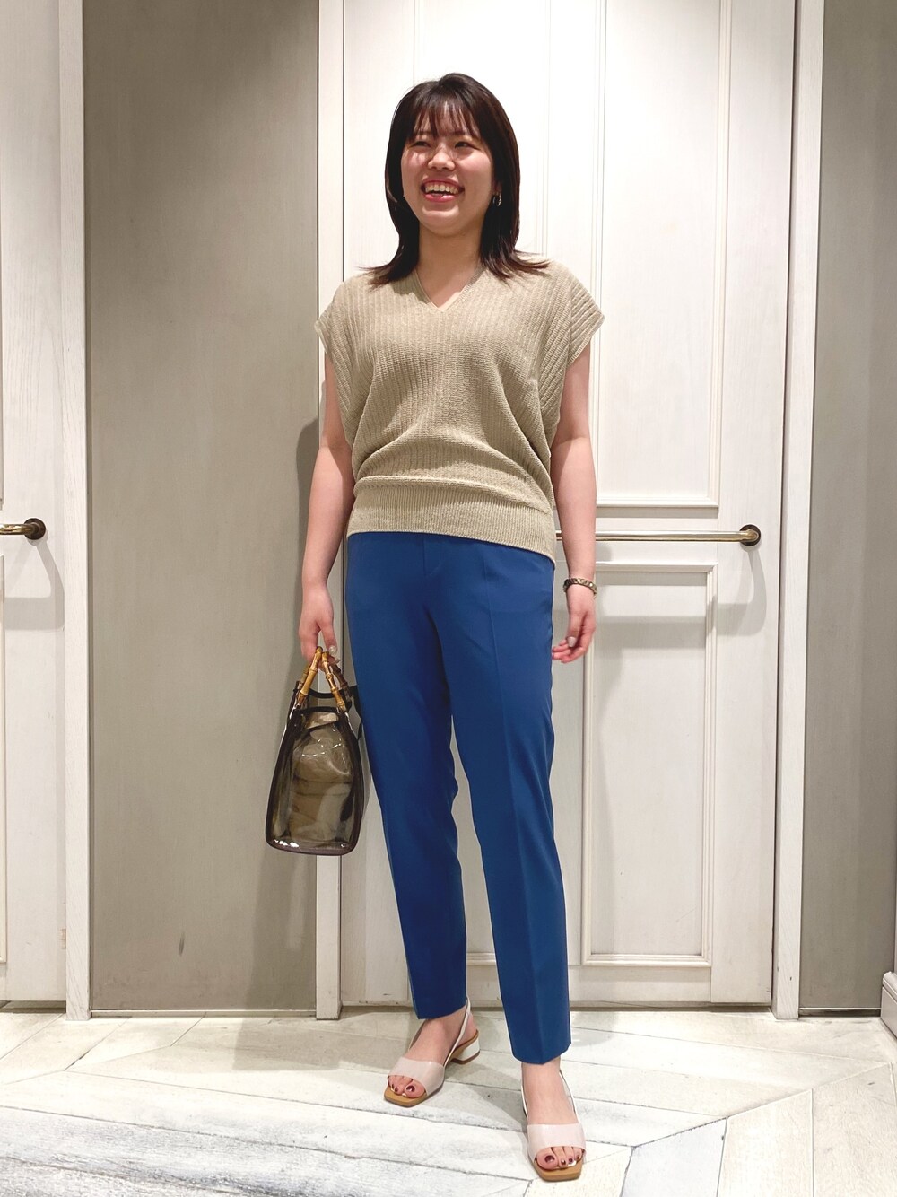 🪴🪴🪴 大人なブルーパンツと フレンチ袖の涼しげサマーニットで おでかけコーデ◎ 上下ともにドライタッチなので 真夏にもピッタリです