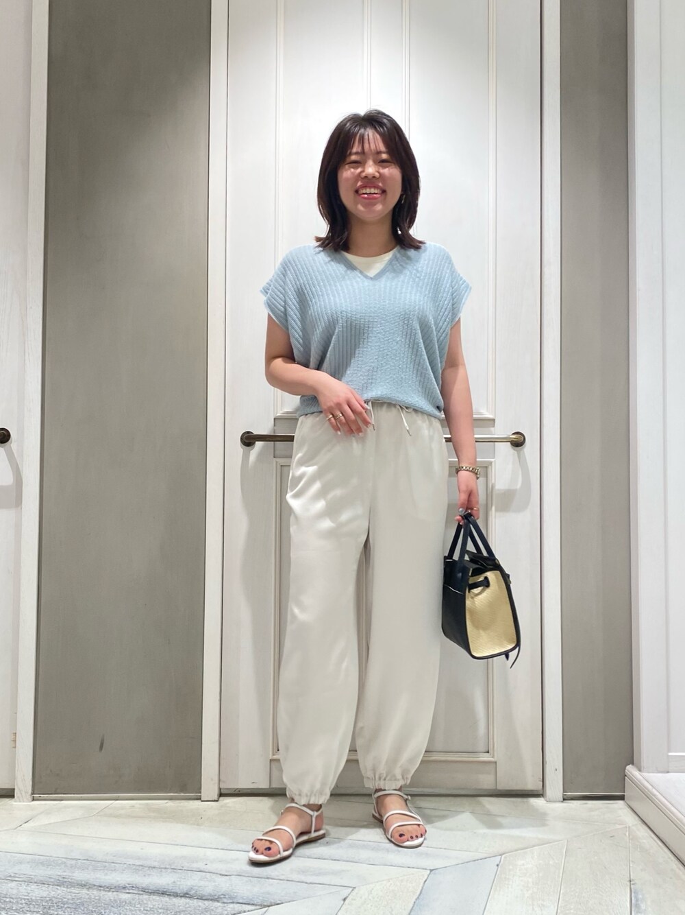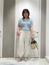 🩵🩵🩵 セールアイテムでオススメコーデ! 涼しげな印象になる ライトブルーのサマーニットと 新作のサテンパンツで旅行にもオススメ