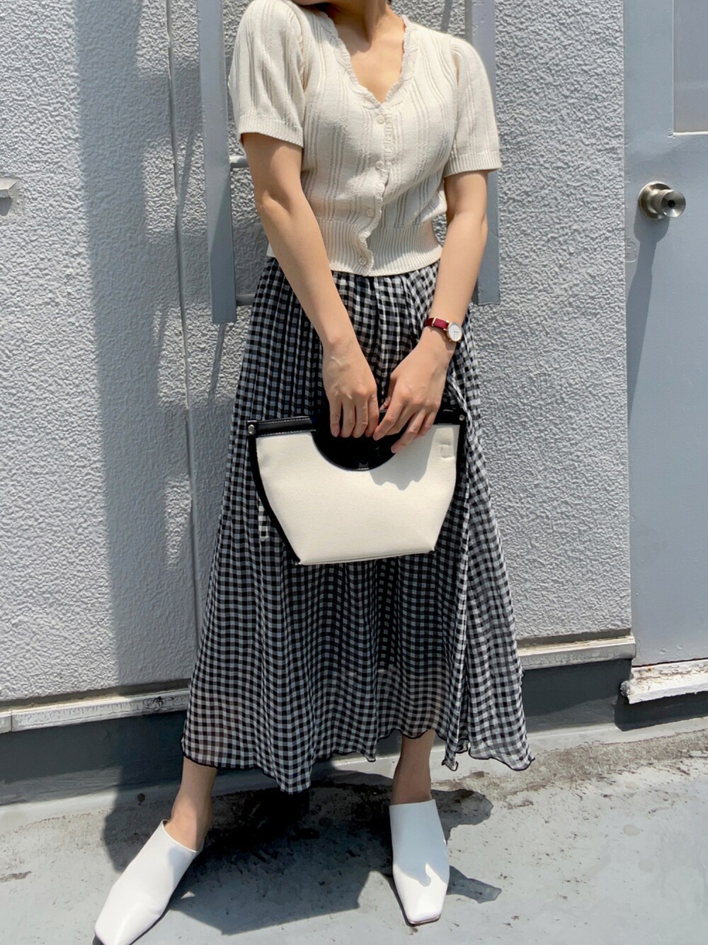 er_o0のシャツ/ブラウス「ランダムリブ編み裾スカラップ2WAYちびカーディガン」を使ったコーディネート