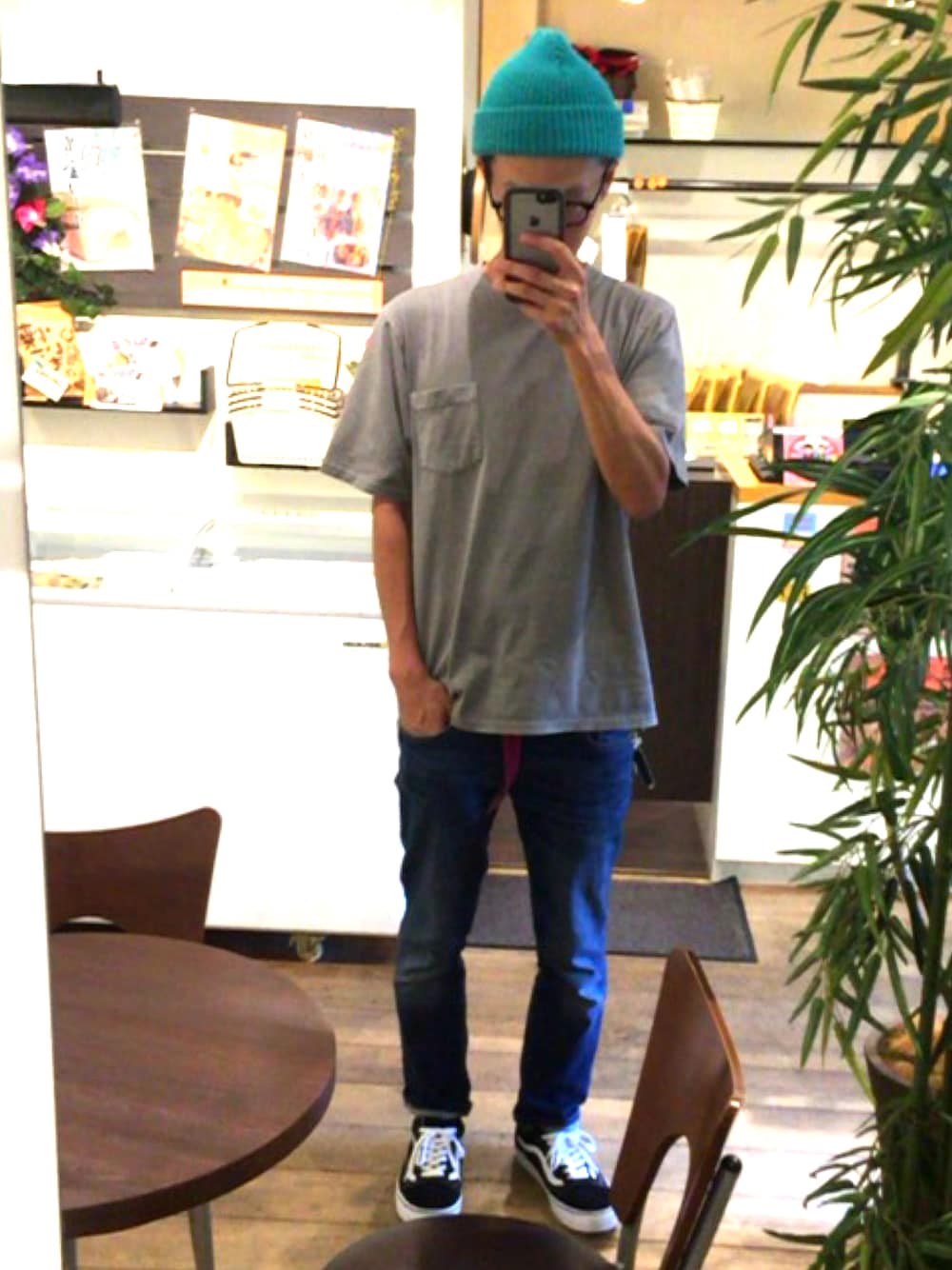 たい焼き屋さんの鏡前にて(笑) セールで700円のUSコットンのトップス 無印のセールのデニム1000円、ビーニー300円、20年愛用しているパタゴニアのベルト。申し分ないプチプラコーデです(笑)