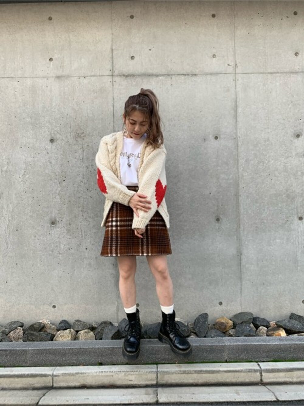肘のハートがとってもキュートな手編みのニットカーディガンにブラウンチェック合わせで落ち着いた雰囲気に☺︎ MODEL:154cm