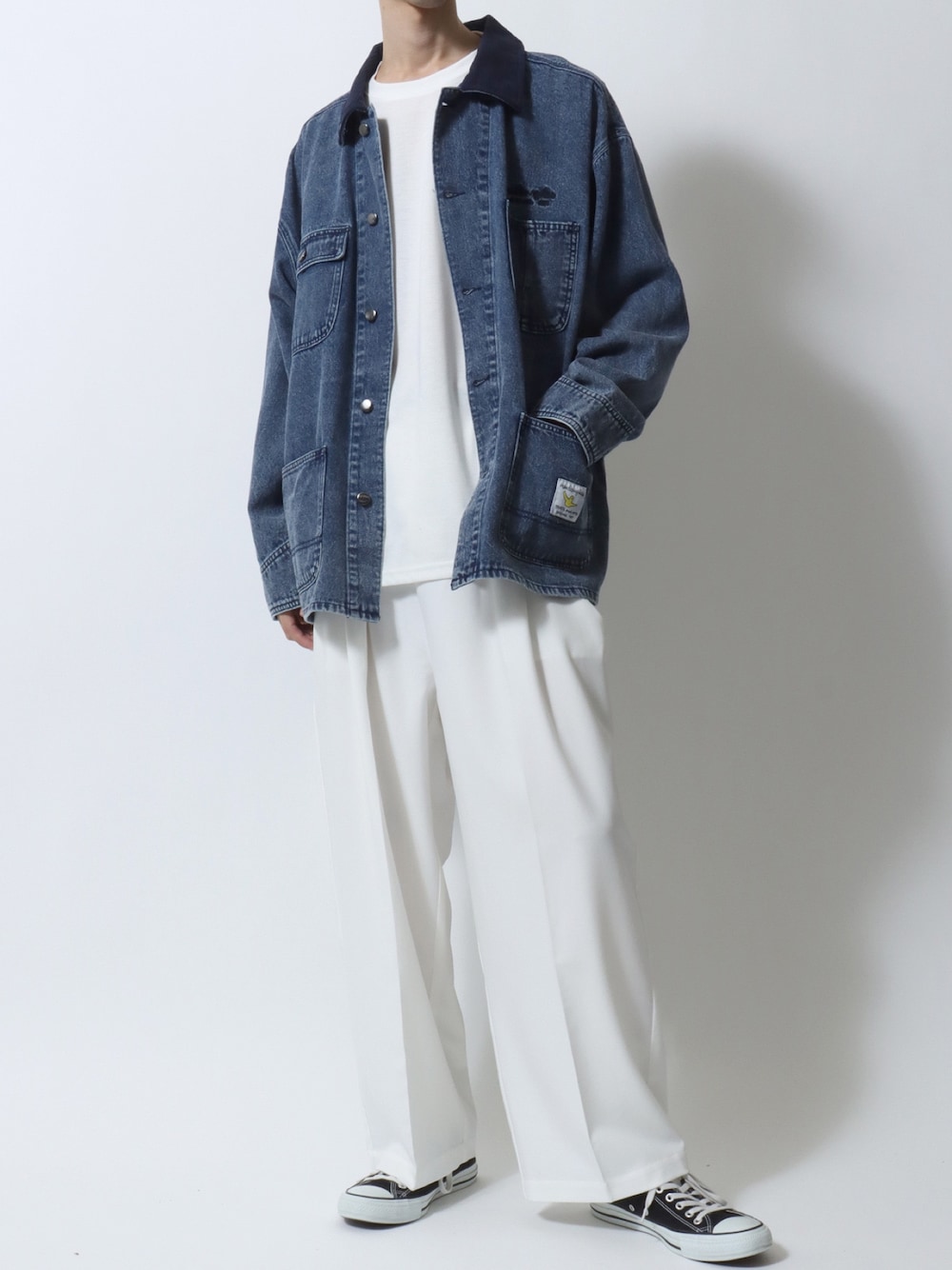 SITRY(SITRY)のカバーオール「MARK GONZALES ARTWORK COLLECTION/マークゴンザレス 別注 オーバーサイズ ワンポイント刺繍 衿コーデュロイ デニムカバーオール デニムジャケット ブルゾン」を使ったコーディネート