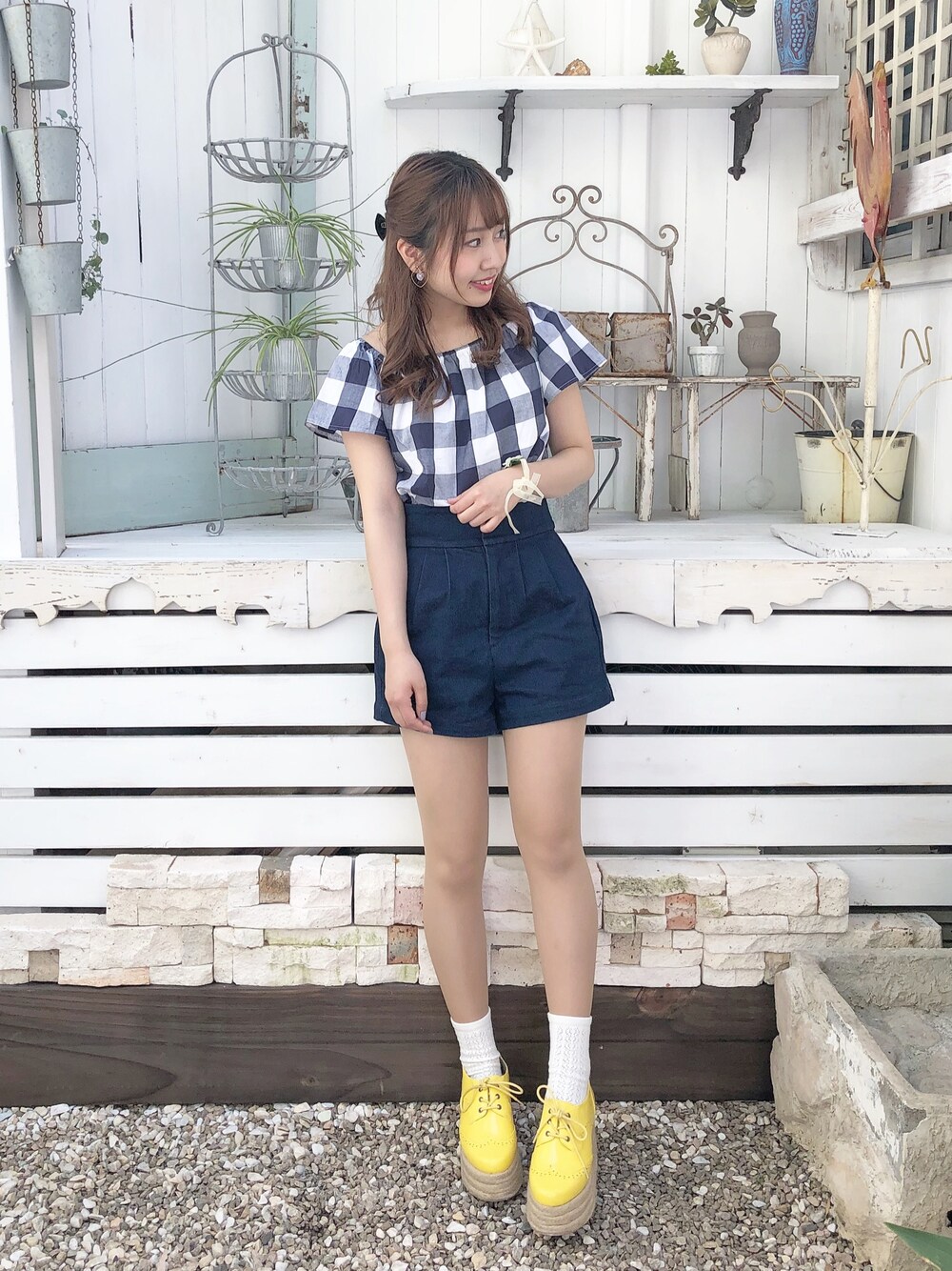 ブルー系のトップス、ブルー系のデニムパンツ、イエロー系のシューズを着用したレディースの春コーディネートの1枚目の写真