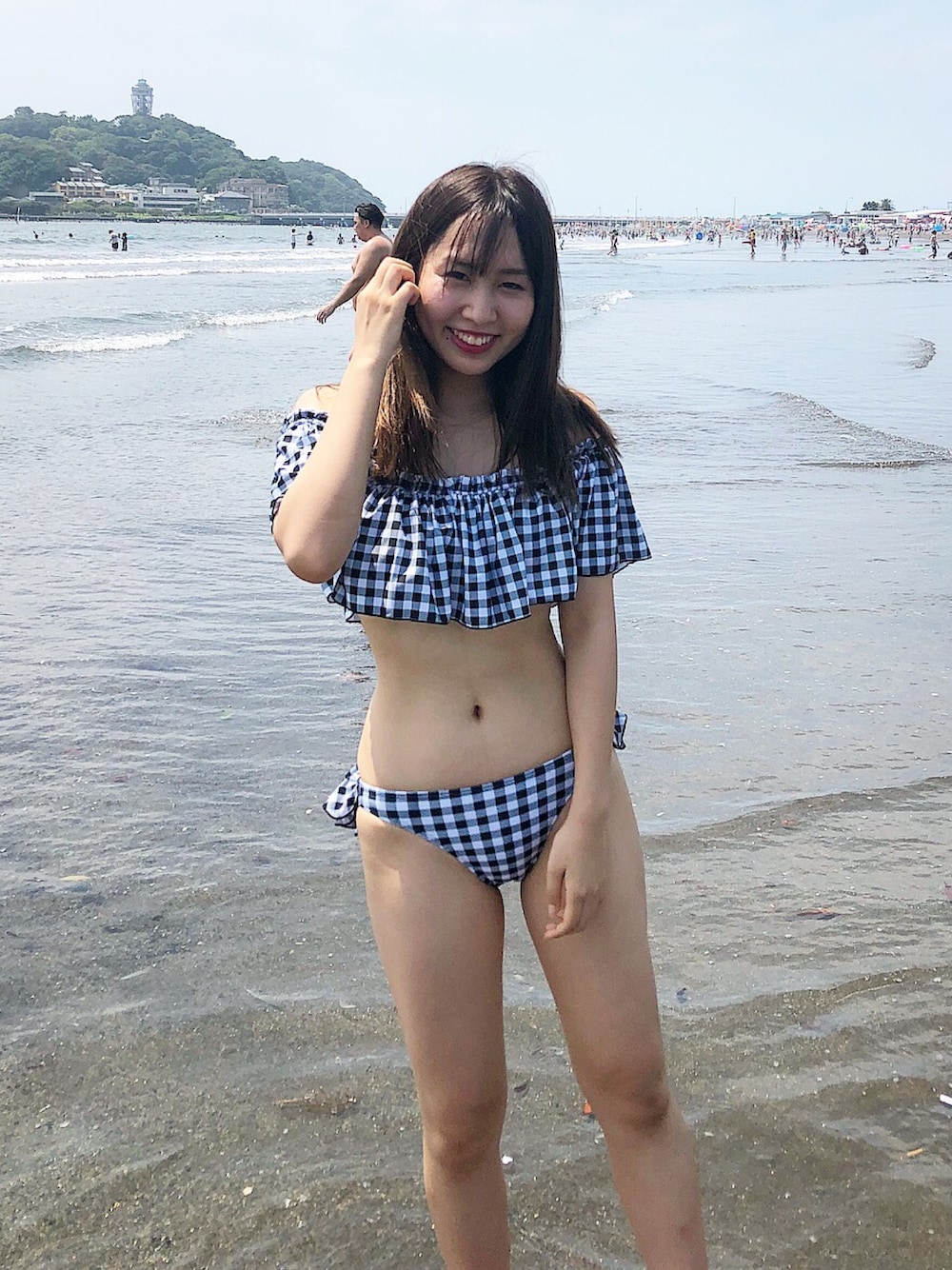 ブラック系の水着を着用したレディースの夏コーディネートの1枚目の写真