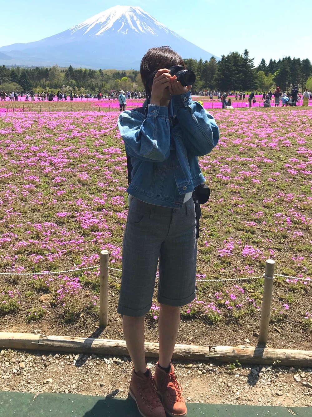 河口湖の芝桜まつりに行ってきました🌸 今日は写真いっぱい撮るために動きやすさを重視!の中に可愛さ加えてみました〜(ビジュー付き) 富士山のおかげで背景に目が…笑 GUのジャケット着まわせてほんとに重宝😋