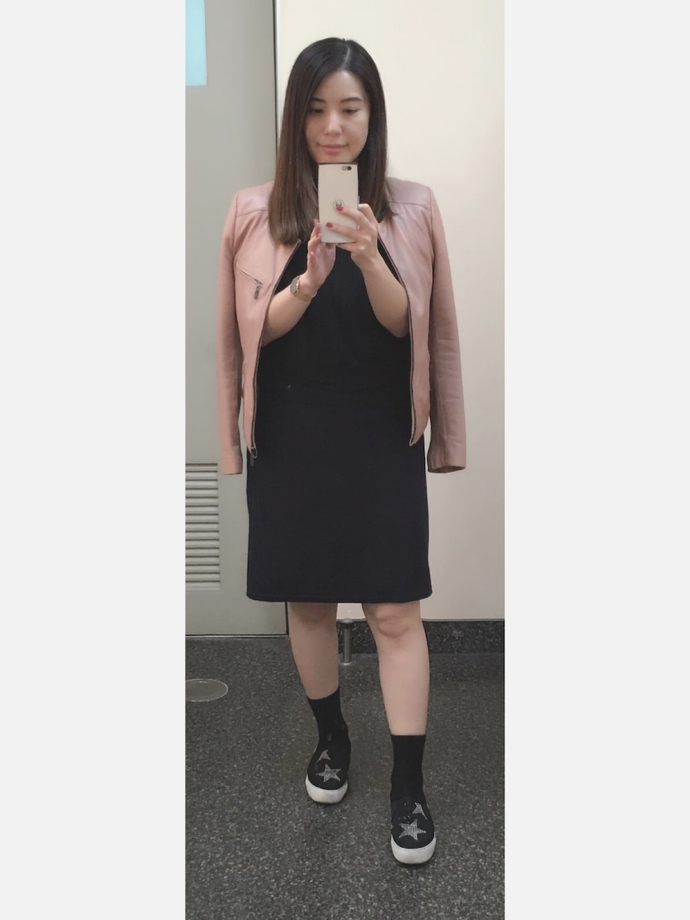 毎年活躍のピンクのレザーJKは韓国で購入してから、重宝してる。 シンプルな黒コーデでも、アクセントに。 ちょいカジュアル度を増させて、 生足靴下スリッポン。 スリッポンは、韓国の南大門で激安で購入した、ラインストーンが散りばめられた、 フラットシューズ。こちらもシンプルコーデの中のアクセントとして。