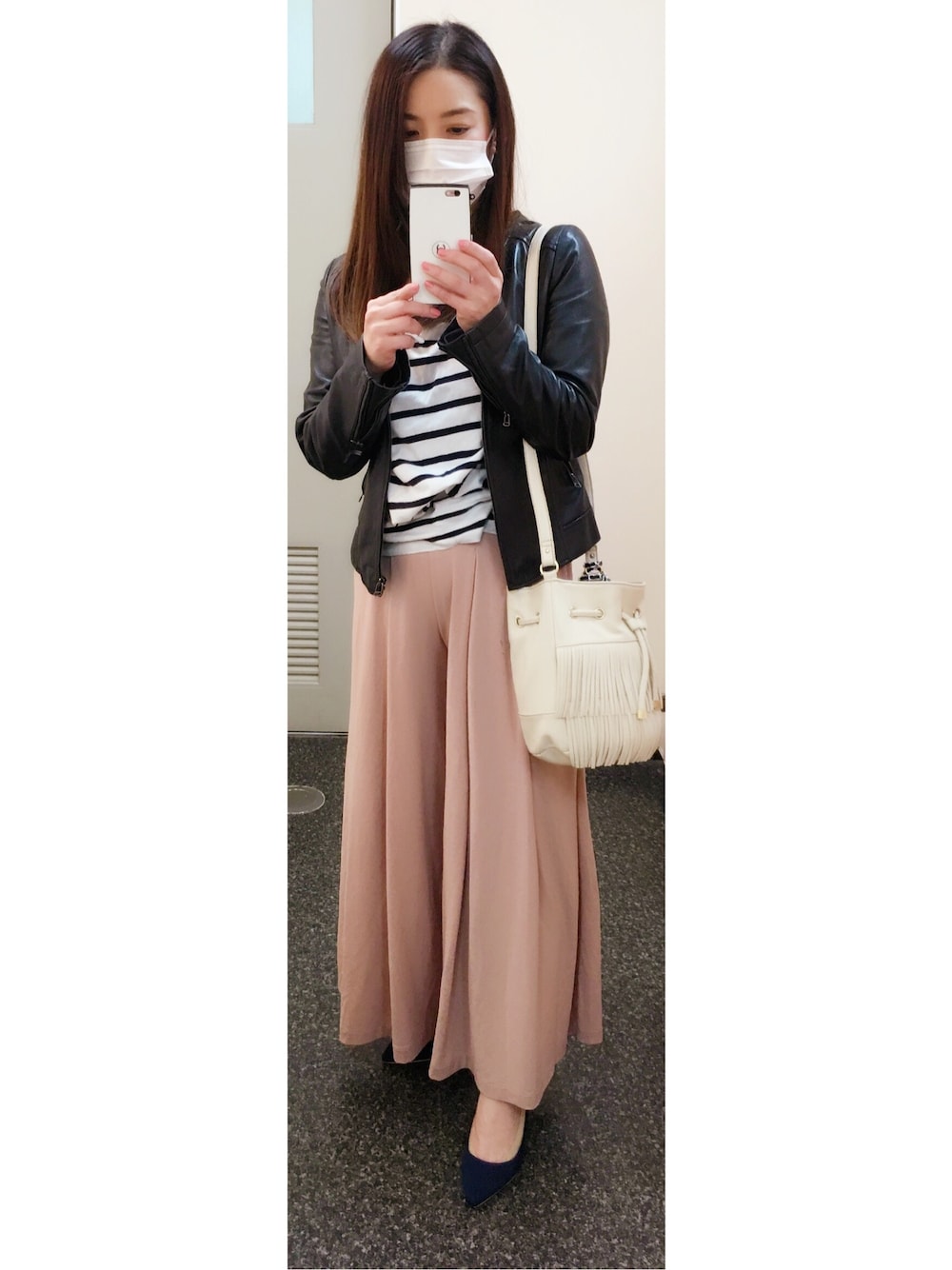 きれい目スタイル。ピンクベージュのガウチョ。
