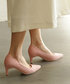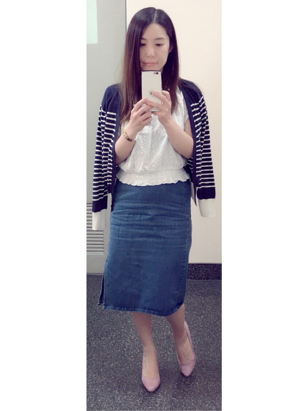 レース調のオフショルトップスにボーダーカーデで甘さを抑えて。デニムスカートもカジュアルになりすぎないように、綺麗色パンプスで。