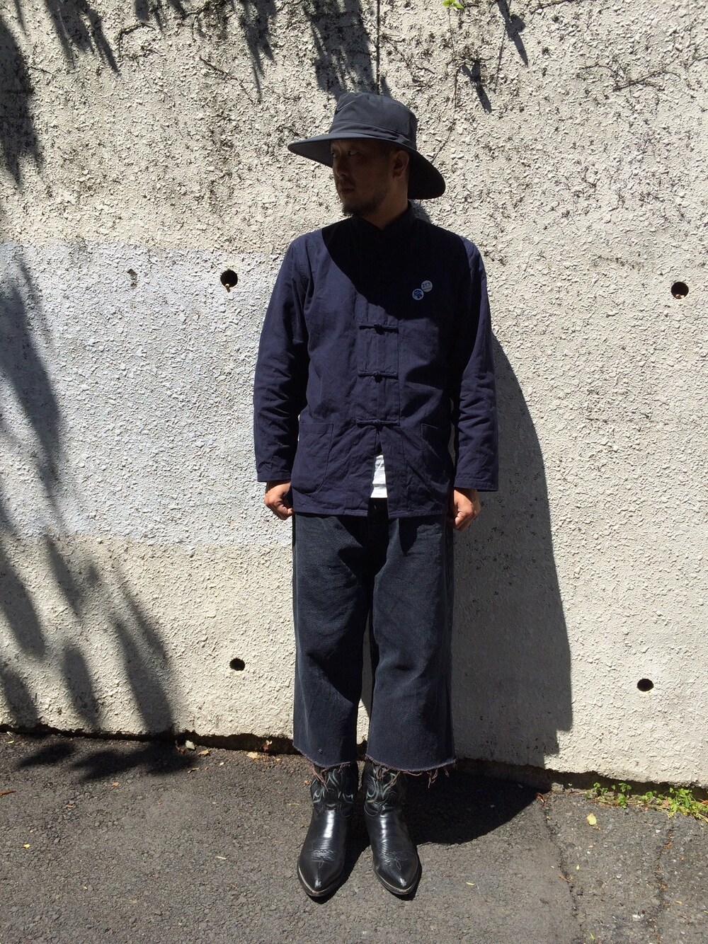 ブラック系のブーツ、ブラック系のハットを着用したメンズの春コーディネートの1枚目の写真