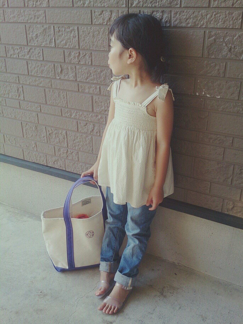 サイズアウトしたワンピースをふんわりトップス風にしてます★ バッグの中身がちょっとみえてしまってる..