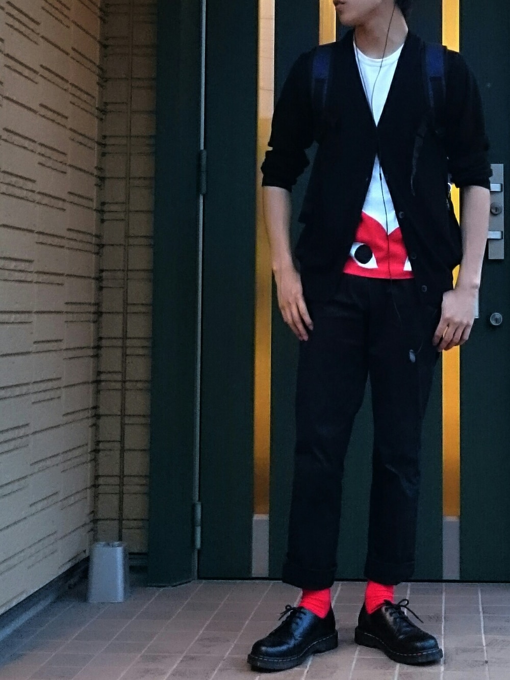 チラリズムで着こなしました 今日は雨だったので丁度いい感じのコーディネートになったかと思います♪(灬ºωº灬) ギャルソンのtシャツと 靴下でアクセント 後は抑えて… カーディガンは上のボタンだけ閉めて playハーツの片目だけが見えるようにしました 片目の方がインパクトが大きいのとあからさまなPLAY厨だと思われないように気を使いました