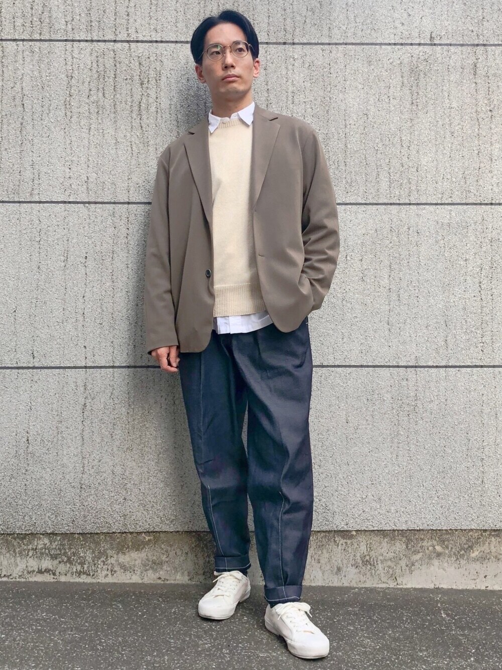 ✅ポイント シャツ+ニット+ジャケットの優等生感あるトップスにデニムのバルーンパンツで変化つけてみました。 ベージュやエクリュカラーで春っぽく優しい感じになったのが個人的に🙆♂️ ジャケット脱いでもバルーンパンツのおかげでサマになるのが嬉しい🤤