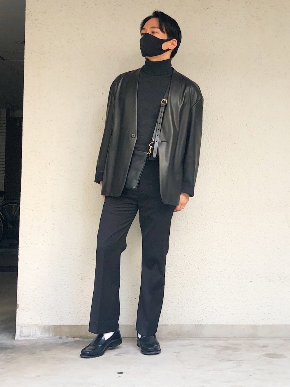 ✅ポイント オールブラックコーデ😎 ノーカラーのジャケットなのでハイネックを合わせて、タックインして上品かつスタイルよく🙆♂️ のっぺりしないよう、ショルダーバッグの金具と靴下でアクセントをつけてます。 ジャケットの袖をロールアップして裏地の切替を見せるのも◎ 桜見にいきたいな〜🌸