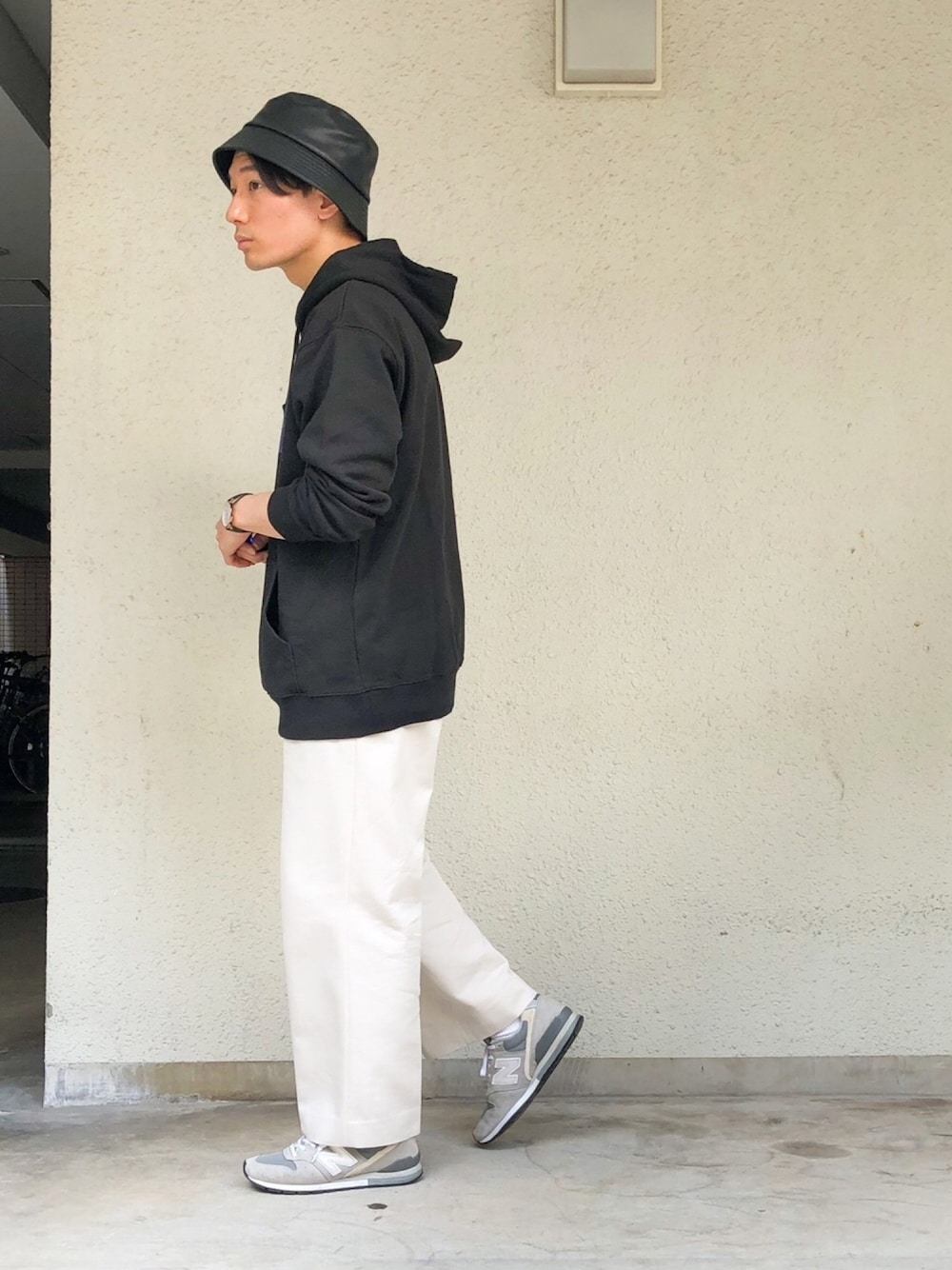 ✅ポイント パーカーをXLでゆるっと、ワイドパンツでユルめのIラインを作ったワンマイルコーデ🚶🏻 レザーのバケットハットでユルくなりすぎないよう調整してるのもポイントです🙆♂️ 袖は捲って春らしく。 シンプルなので時計等をつけてアクセントにしてます◎ 実はオタクアパレルのコーデ、尊さまのある生活🍶