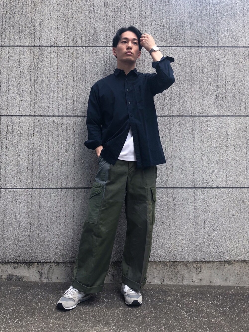 ✅ポイント ワイドなカーゴパンツでAラインを意識したコーデです🙌 カーキ+ネイビーの組み合わせが🙆♂️ シャツのボタン下2つを開けて白をチラ見せしてるのもポイントです◎