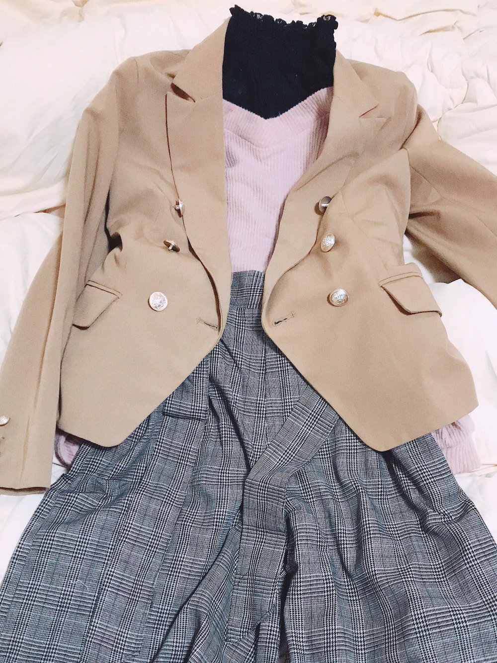 黒レースのインナー ピンクの後ろリボンつきニット ハイウエストのチェックワイドパンツ テーラードジャケット これ早く着たい 個人的な春コーデ あえてピンクのNBのスニーカーできちんとさをカジュアルさで外したい 姿見が今ないのでこの形ですいません 着たらまた写真あげますね