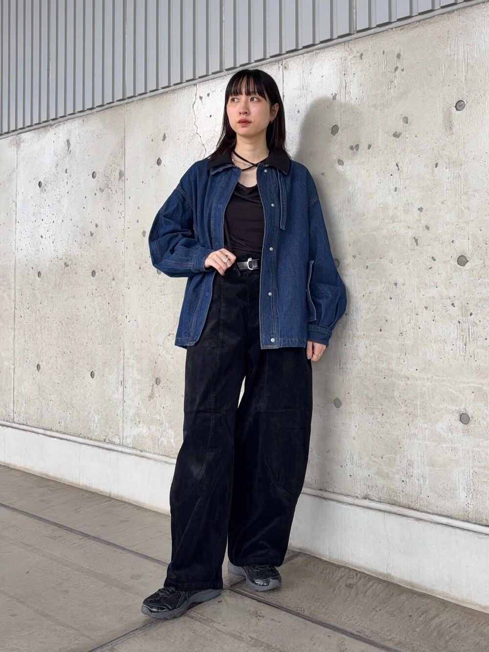 ゆるっとしたサイズ感が可愛いデニムアウターです🥰 襟元のコーデュロイと合わせて同素材のパンツでまとめました◎