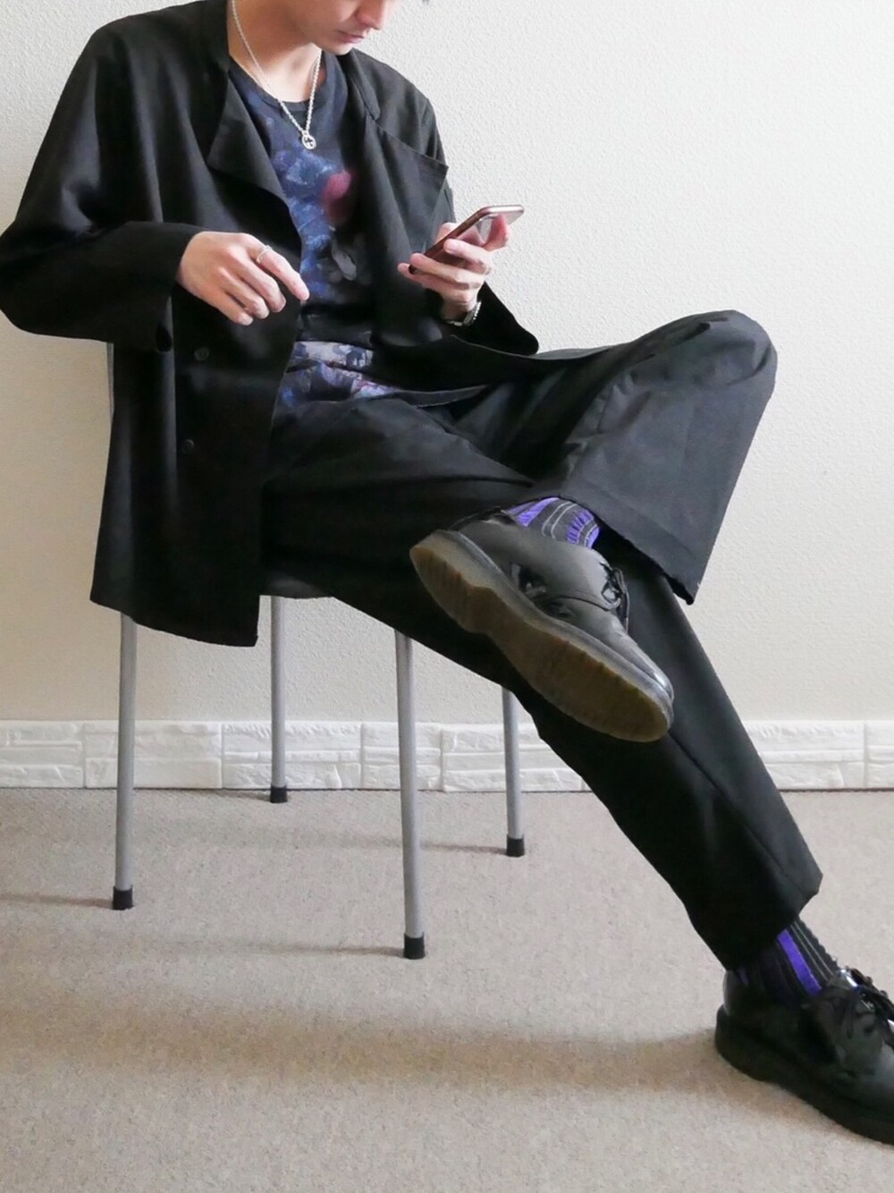 ご観覧ありがとうございます🙇♂️ 今回はたまに僕の中で流れが来る ブラックコーデです❗️ ポイントとしては ①ブラックコーデで渋さや落ち着いた感じを演出! ②ソックスのパープルと花柄Tシャツのパープルを合わせて揃えています🙇♂️ ⑶シューズもソックスもあえて暗めにして、よりブラックコーデに寄せています❗️