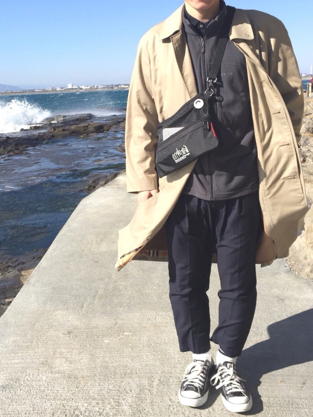 江ノ島に行ったら強風で波がうねっていました。 バーバリーのコートとマンハッタンのサコッシュがお気に入りです。 写真には写ってませんが1LDKのキャップ被ってます。